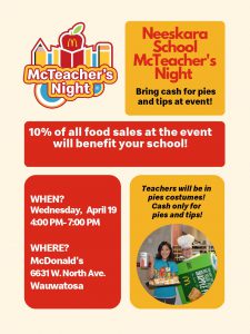 Neeskara will be hosting a McTeacher’s Night at the McDonald’s on 67th & North Avenue on Wednesday, April 19th, 2023 from 4:00 – 7:00 p.m. The school will receive 10% of all food items purchased at this event. The 10% will help us fund the end of the year events. So come out and support Neeskara.