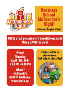 Neeskara families we will be hosting a McDonald’s McTeacher’s Night on Thursday, April 18, 2024, from 4:00 – 6:00 p.m. Families can come to the McDonald’s on 66th and North Avenue to purchase food from the Neeskara staff. We will be working and greeting our families at this location from 4:00 – 6:00 p.m. Don’t miss this great event. Here’s a picture from last year’s event